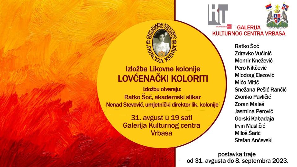 У Галерији Културног центра Врбаса, у четвртак 31. августа 2023. године биће отворена изложба одабраних радова насталих на Ликовној колонији „Ловћеначки колорити“ 14 академских сликара из Црне Горе, Србије, Француске и Северне Македоније.