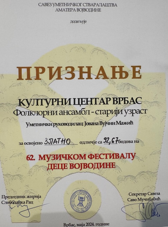 Низ успеха настављен је и овога пута - ЗЛАТНА МЕДАЉА за наступ на 62. Фестивалу фолкорних ансамбала деце Војводине припала је Дечијем фолклорном ансамблу Културног центра Врбаса. Ансамбл је награђен за кореографију Игре из Брусника, уметничке руководитељке и кореографкиње Јоване Вујчин Мажић и кореографа Љубомира Вујчина, као и руководиоца оркестра Предрага Алексића.